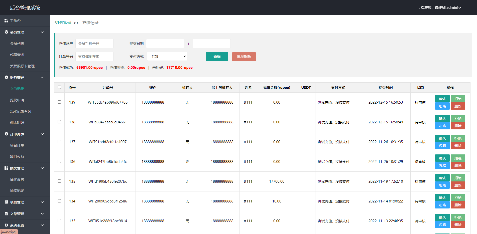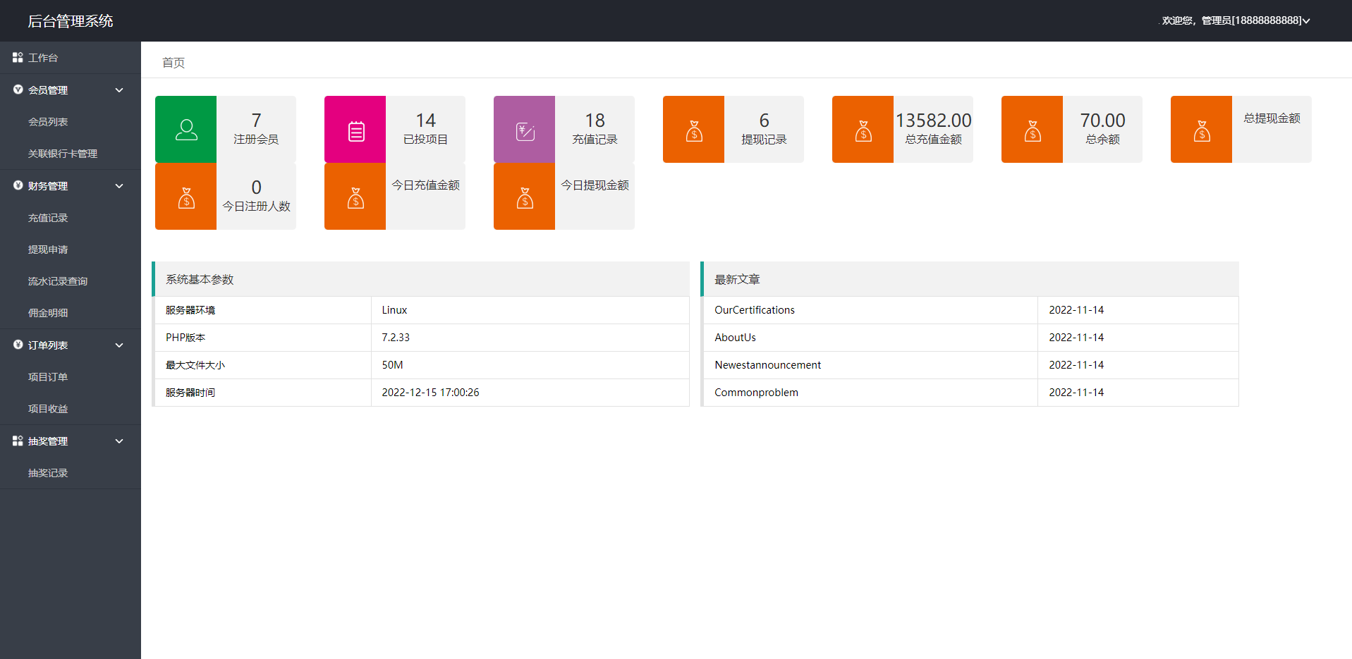 1.转盘:一共6个奖项,第6为谢谢参与,谢谢参与的概率考虑进去,总概率是100 , 2.代理后台团队查询 3.每天返利 ,到期还本,附加脚本。 4.邀请投资1级分佣 邀请投资2级分佣 邀请投资3级分佣 声明:本站所有文章,如无特殊说明或标注,均为本站原创发布。任何个人或组织,在未征得本站同意时,禁止复制、盗用、采集、发布本站内容到任何网站、书籍等各类媒体平台。如若本站内容侵犯了原著者的合法权益,可联系我们进行处理。